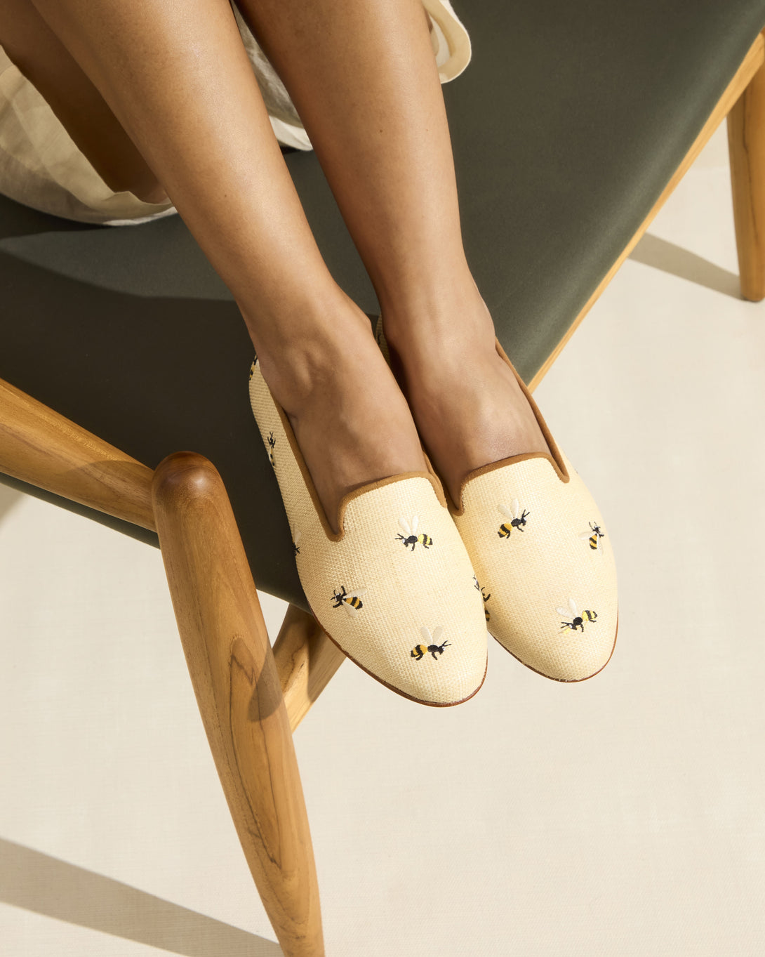 O Loafer Hive Summer combina leveza e sofisticação em um design que celebra o verão. Confeccionado em palha tom natural, o modelo ganha bordados exclusivos inspirados no universo das abelhas, traduzindo delicadeza e autenticidade em cada detalhe.