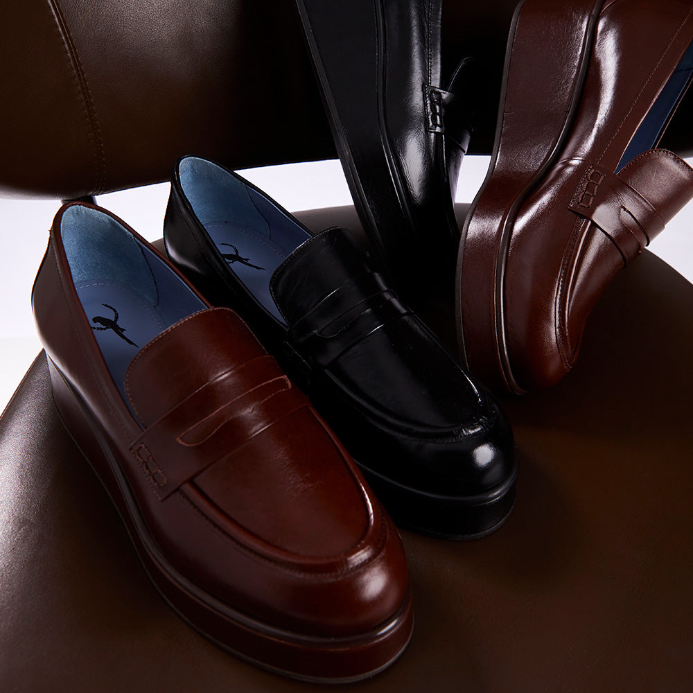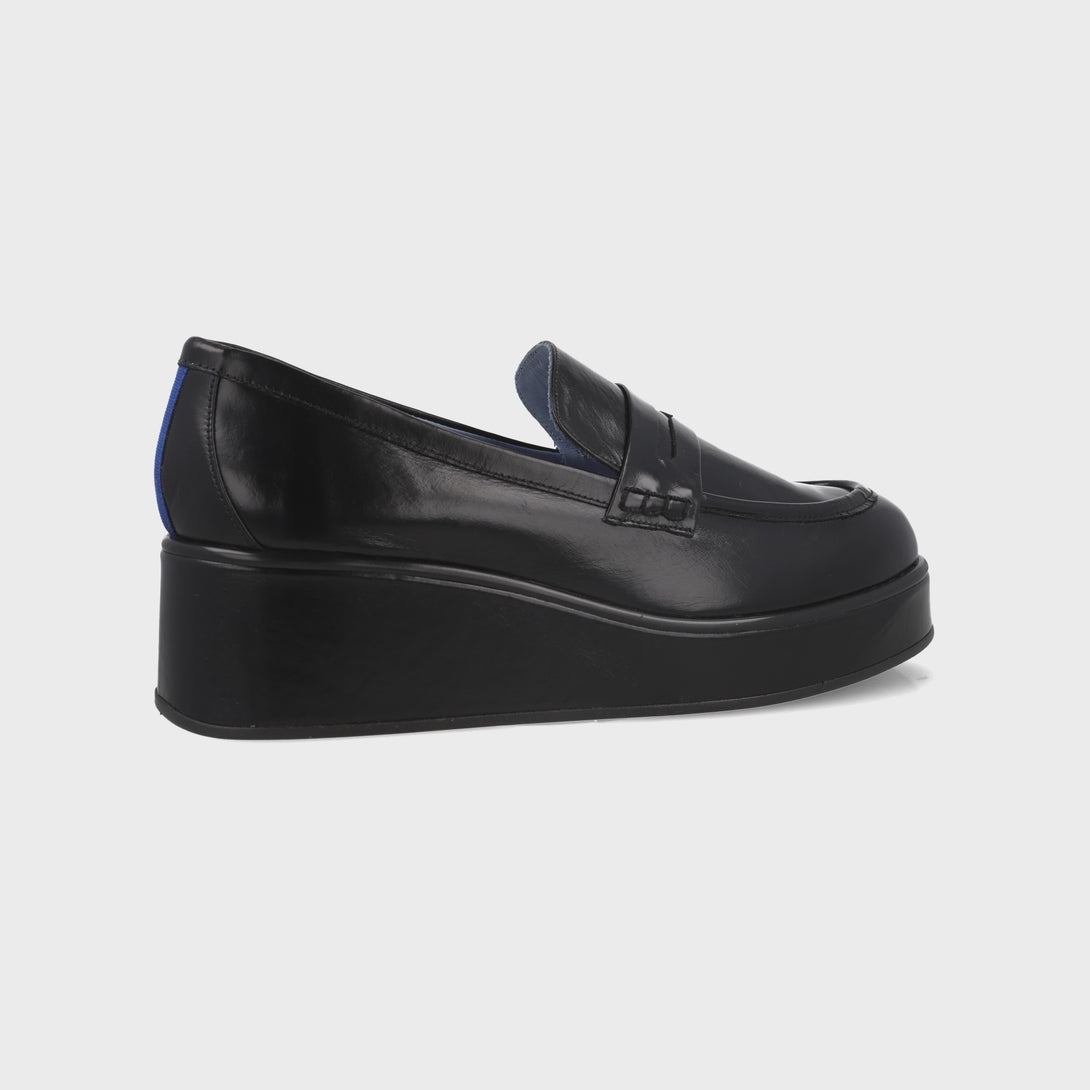 Sofisticação em sua forma mais pura. O loafer wedge preto de couro liso aposta na sola plataforma para trazer imponência ao visual. A palmilha comfort azul, com 7mm de espuma, entrega uma experiência de uso extremamente confortável, enquanto a tira azul Klein na parte traseira reafirma o DNA da Bird & Co — onde design e identidade caminham juntos. Essencial para looks urbanos e contemporâneos.