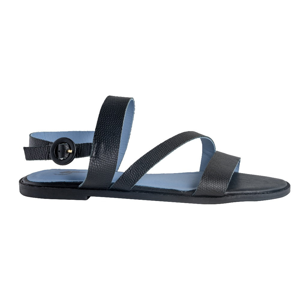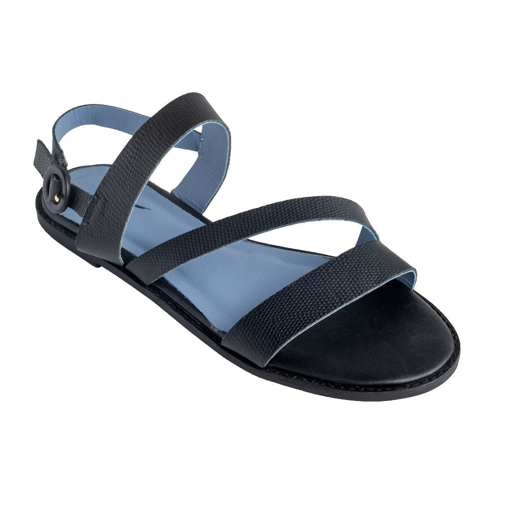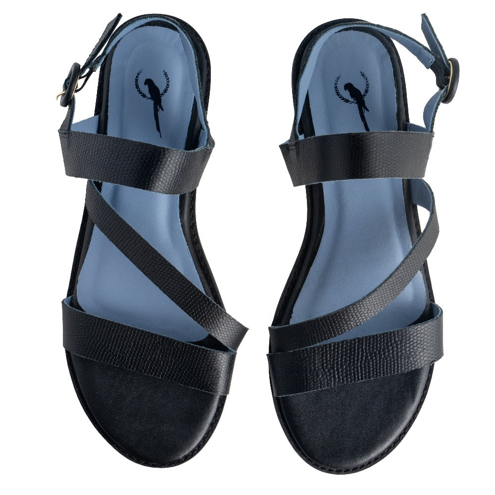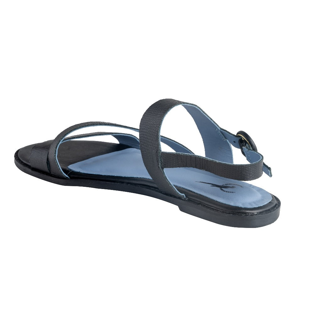 Modelo confeccionado em couro texturizado na cor preta com três tiras frontais e uma tira posterior, fecho por fivela emcapada no mesmo material, palmilha comfort anatômica com 7 mm de espuma e gota aplicada cor azul, exclusiva BLUE BIRD.