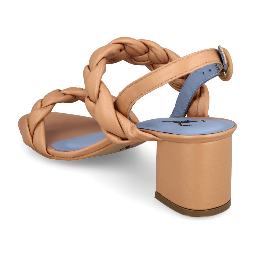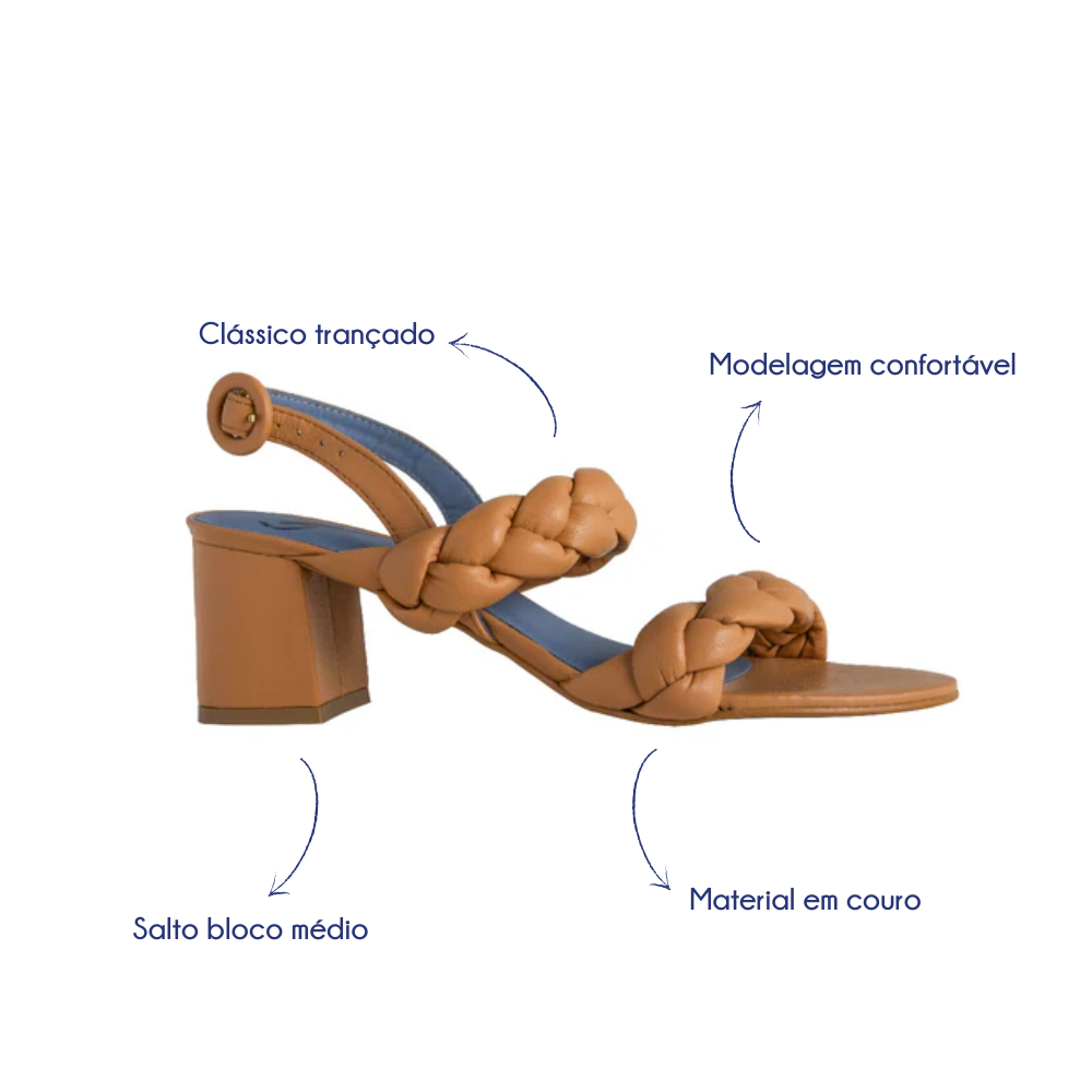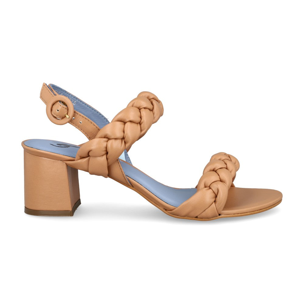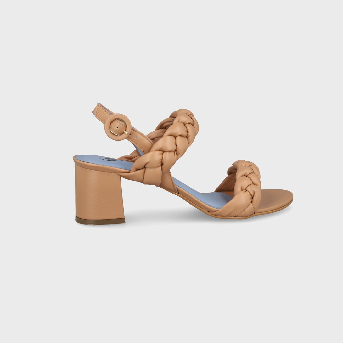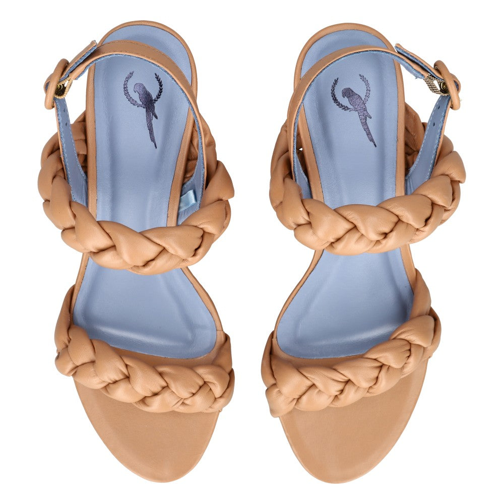 Modelo confeccionado em couro na cor nude com tiras frontais trançadas, salto médio e palmilha comfort anatômica com 7mm de espuma na cor azul exclusiva Bird & Co.