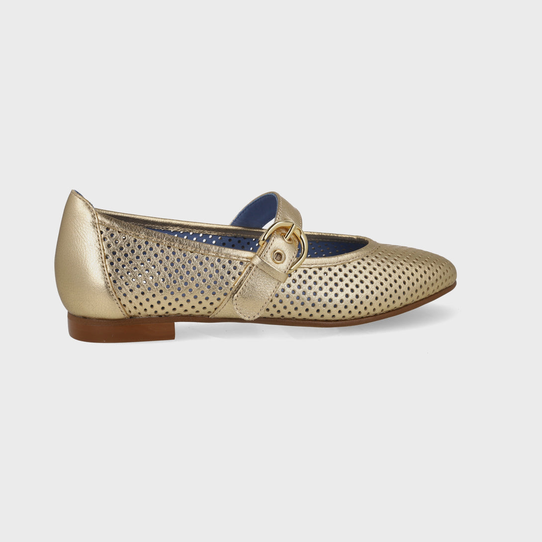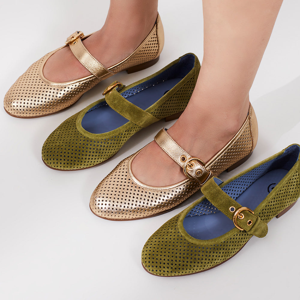 Em sintonia com o brilho e a leveza da temporada, a Sapatilha Saudade em couro metalizado ouro une conforto e versatilidade. O acabamento perfurado garante frescor, enquanto o tom metalizado ilumina produções do dia à noite.
