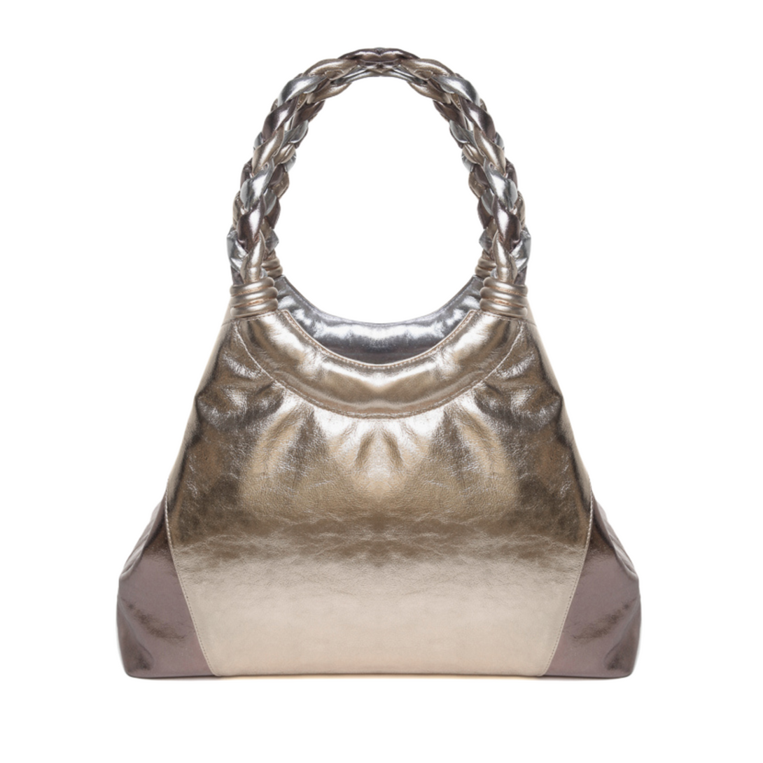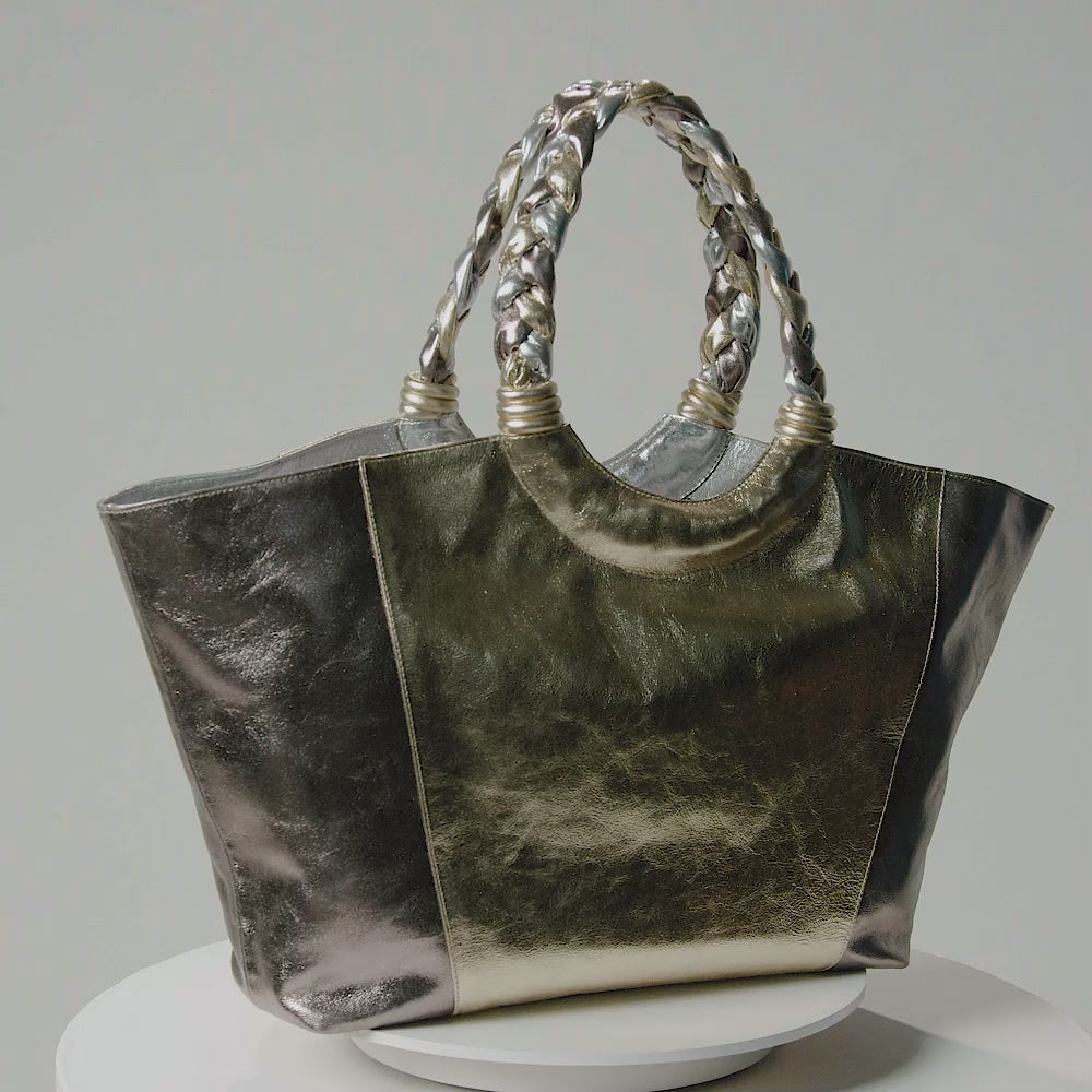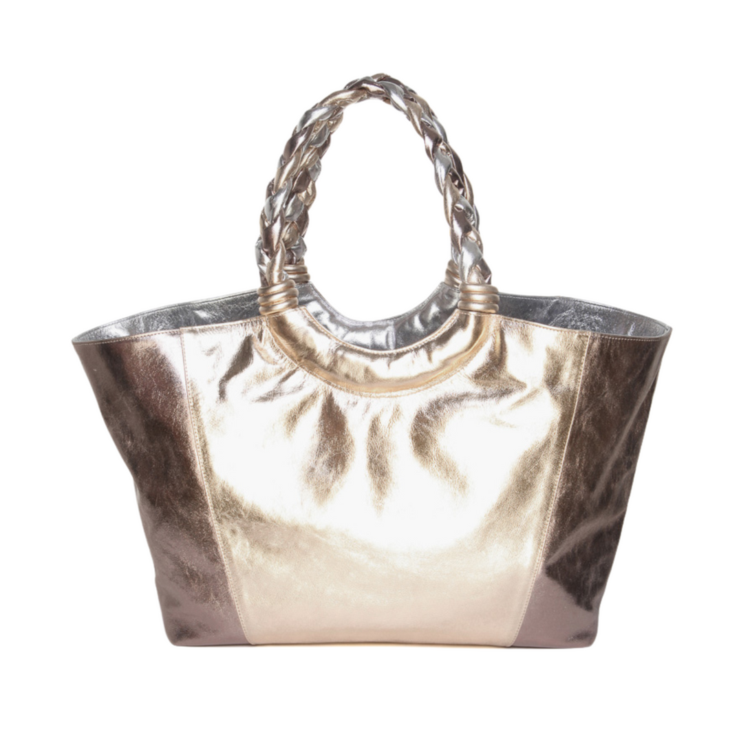 Feita em couro com acabamento metalizado, essa shopping bag mescla os tons de prata e dourado em um design luxuoso e moderno. As alças trançadas completam o visual sofisticado, oferecendo conforto ao carregar. Com amplo espaço interno, essa bolsa é perfeita para acompanhar o dia a dia com muito estilo e praticidade. Um acessório essencial para quem valoriza tanto a estética quanto a funcionalidade, elevando qualquer look com o brilho dos detalhes metalizados.