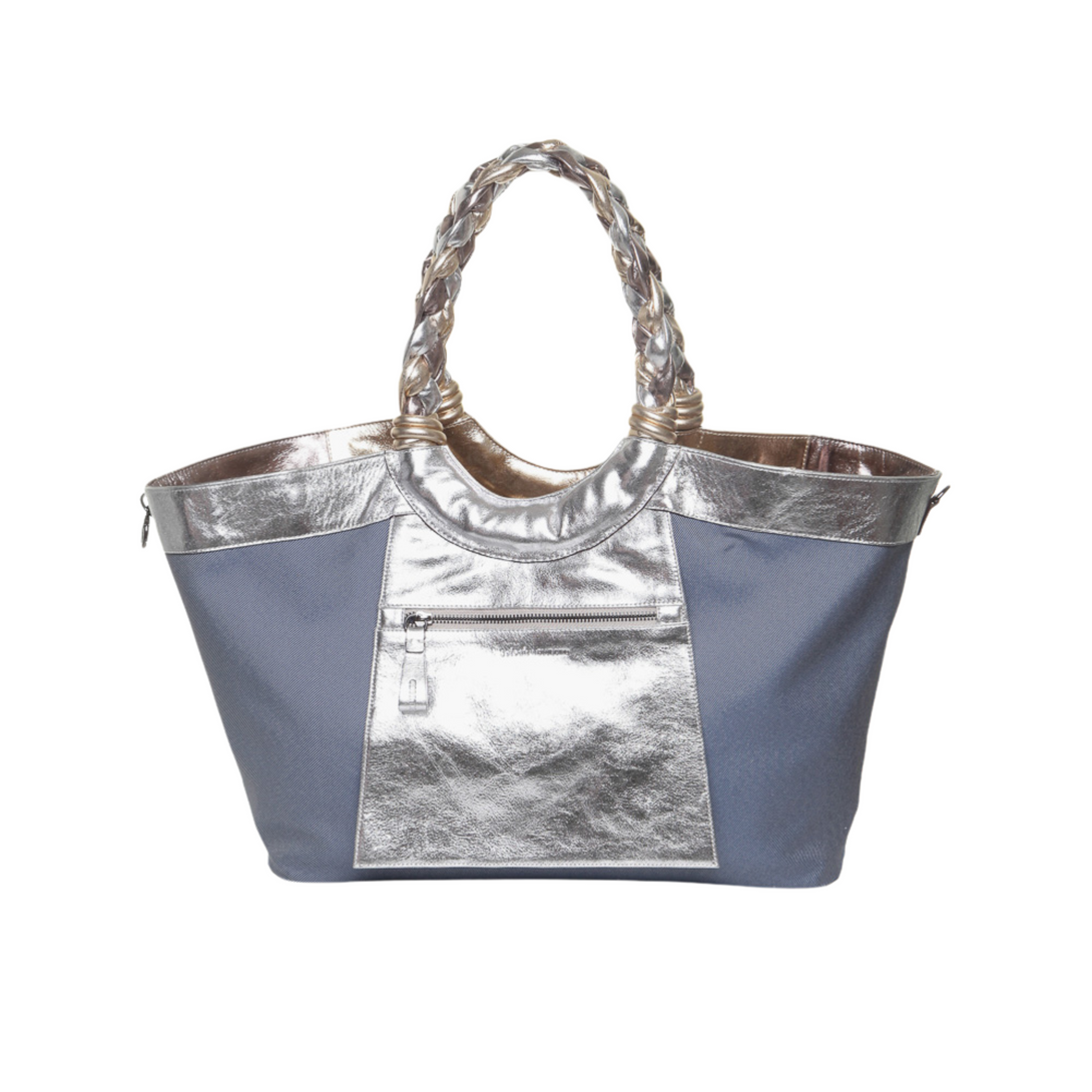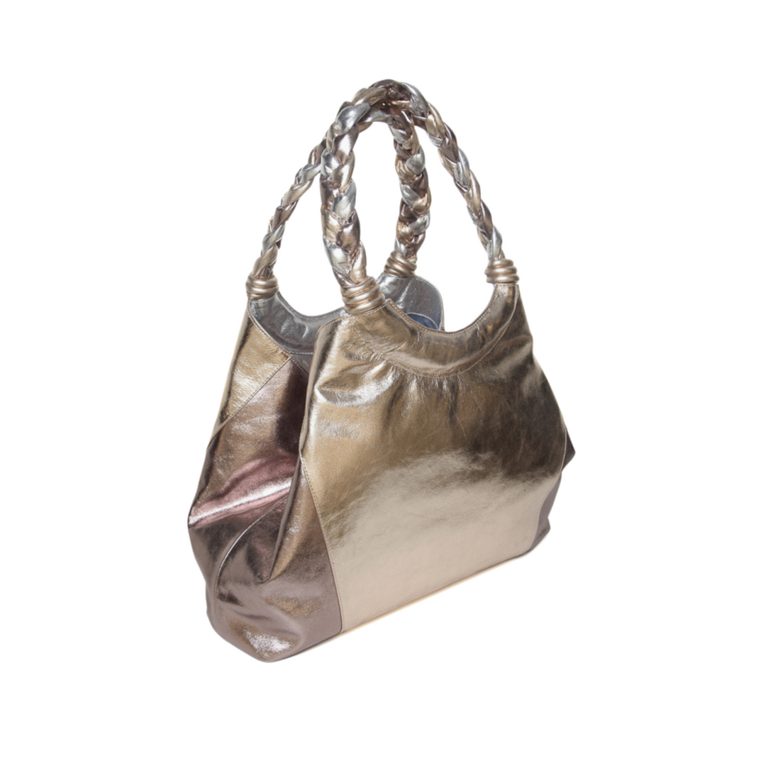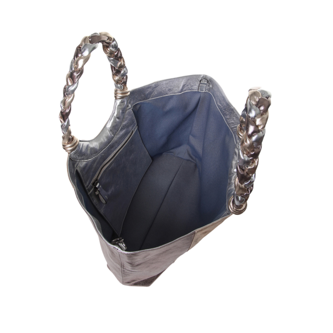 Feita em couro com acabamento metalizado, essa shopping bag mescla os tons de prata e dourado em um design luxuoso e moderno. As alças trançadas completam o visual sofisticado, oferecendo conforto ao carregar. Com amplo espaço interno, essa bolsa é perfeita para acompanhar o dia a dia com muito estilo e praticidade. Um acessório essencial para quem valoriza tanto a estética quanto a funcionalidade, elevando qualquer look com o brilho dos detalhes metalizados.