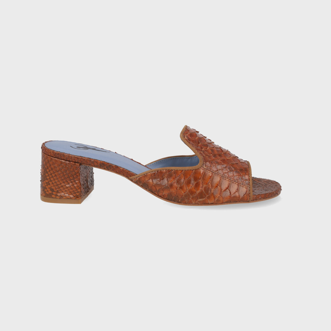 Essa mule em couro de python na cor caramelo é a perfeita combinação de elegância e versatilidade. O tom terroso oferece sofisticação e modernidade, tornando-a uma opção ideal para diversos looks, do casual ao formal. Com seu salto médio e textura exótica, proporciona um conforto duradouro sem comprometer o estilo. O forro azul interno, assinatura da Blue Bird, confere exclusividade e requinte à peça, ideal para quem busca um toque refinado e contemporâneo.