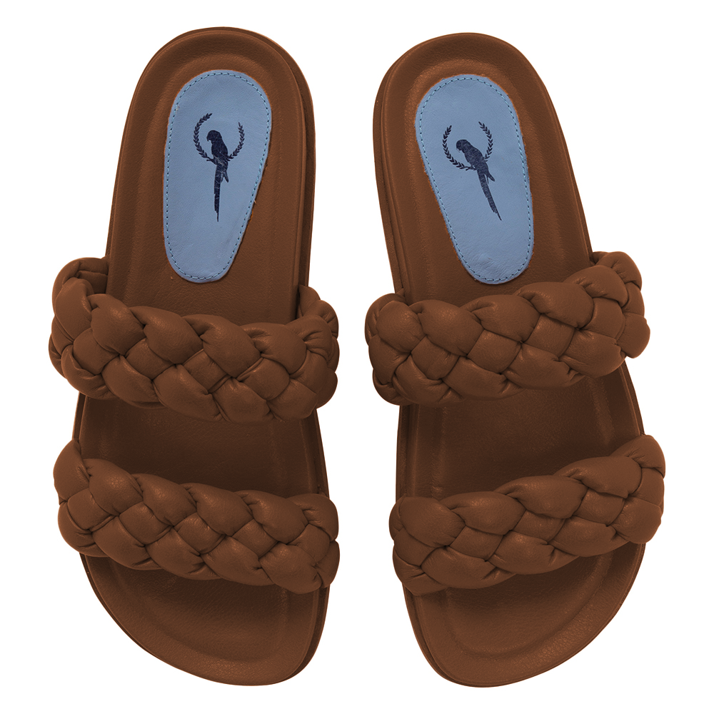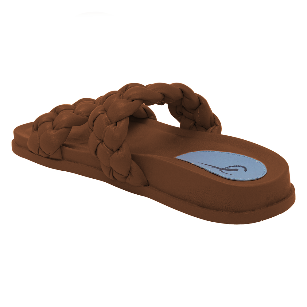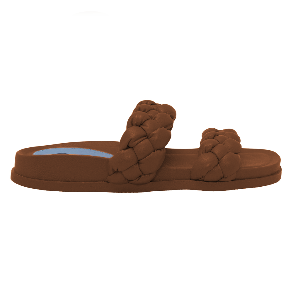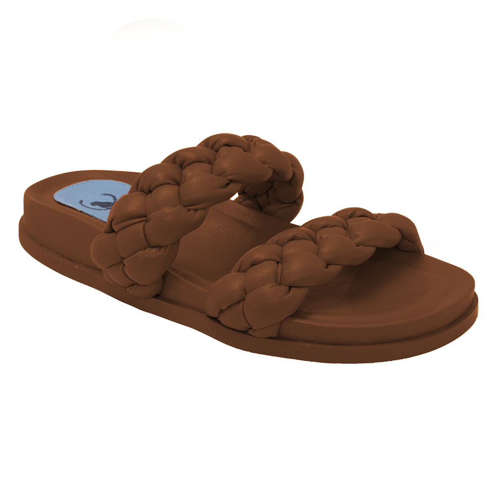 Modelo confeccionado com duas tiras frontais em formato de trança, possui interior acolchoado com textura lisa, palmilha em couro formato gota, cor azul exclusiva BLUE BIRD.