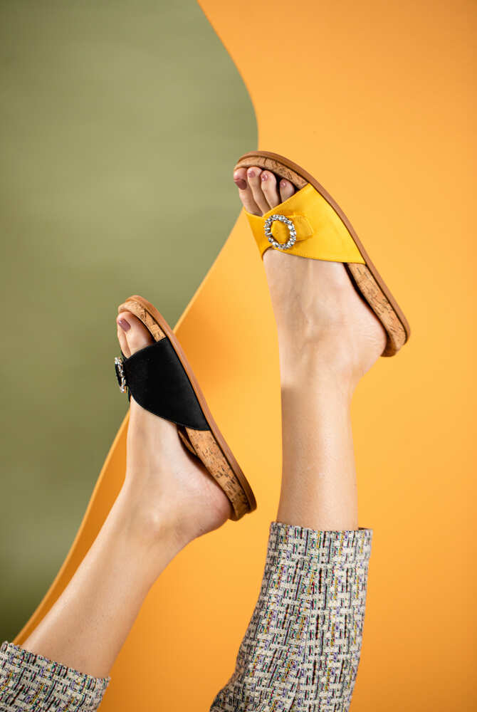 Modelo confeccionado em cortiça, com tira frontal em cetim na cor amarelo, detalhe de fivela ajustável em strass e palmilha em formato gota, cor verde acqua, exclusiva BLUE BIRD.
