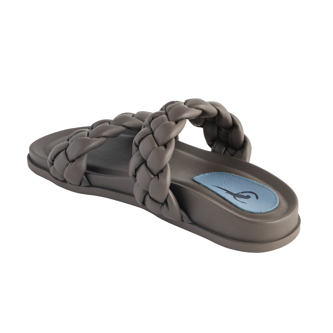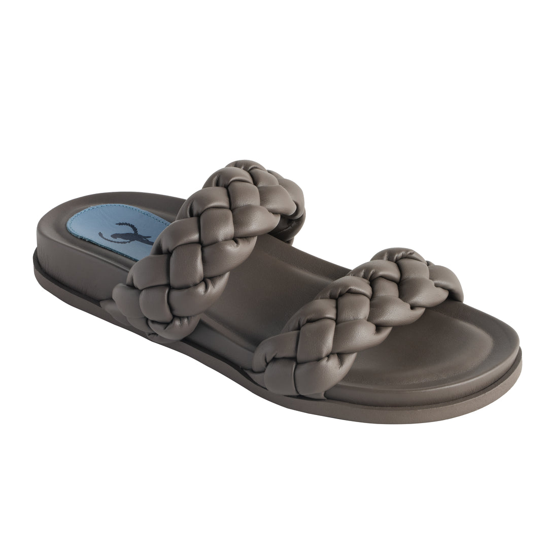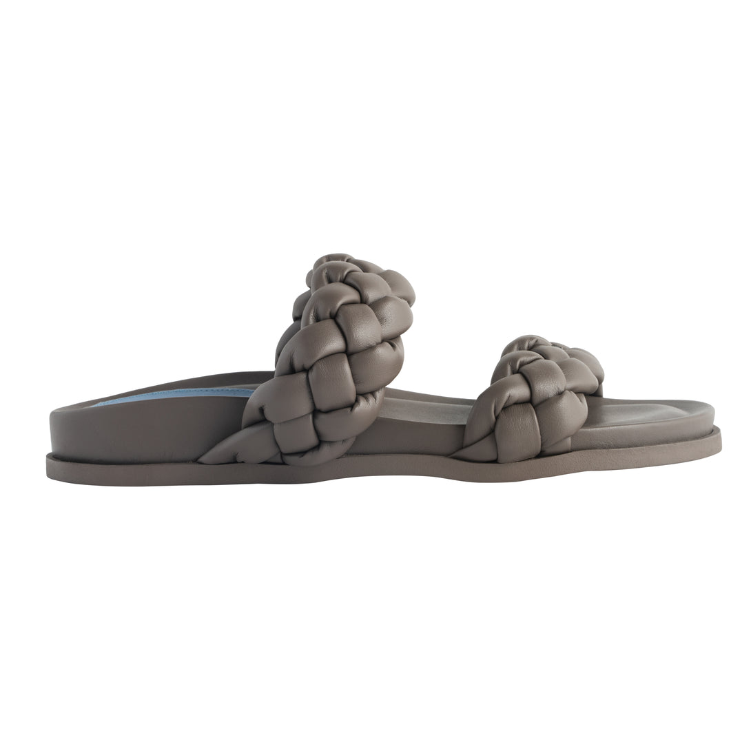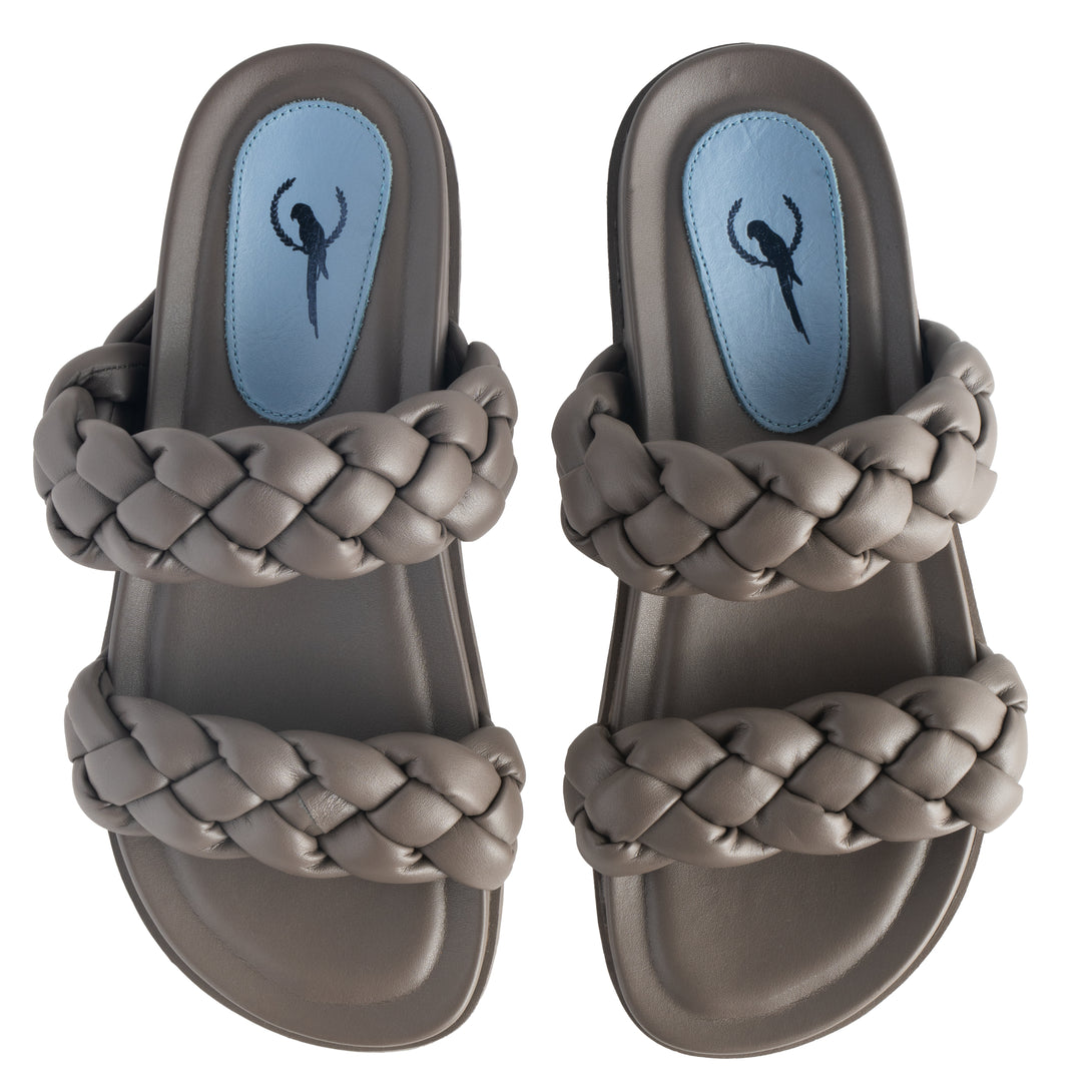 Modelo confeccionado com duas tiras frontais em formato de trança na cor cinza, possui interior acolchoado com textura lisa, palmilha em couro formato gota, cor azul exclusiva BLUE BIRD.