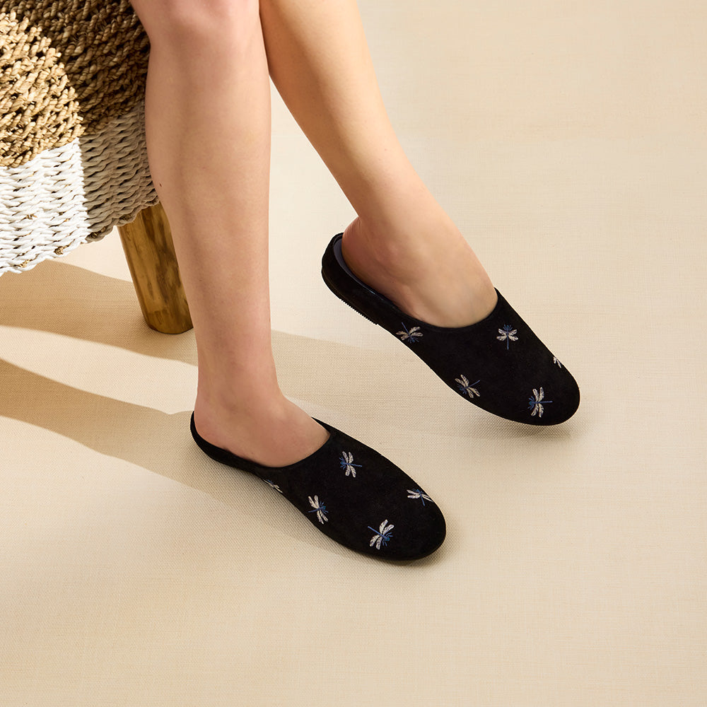Clássico, confortável e cheio de personalidade. O Slip Tóquio em camurça preta recebe bordados delicados de libélulas, que trazem charme e leveza ao modelo. Um calçado versátil e atemporal, ideal para compor produções descomplicadas com um toque sofisticado. Internamente, conta com a exclusiva palmilha comfort azul da marca, que garante maciez e bem-estar durante todo o dia.